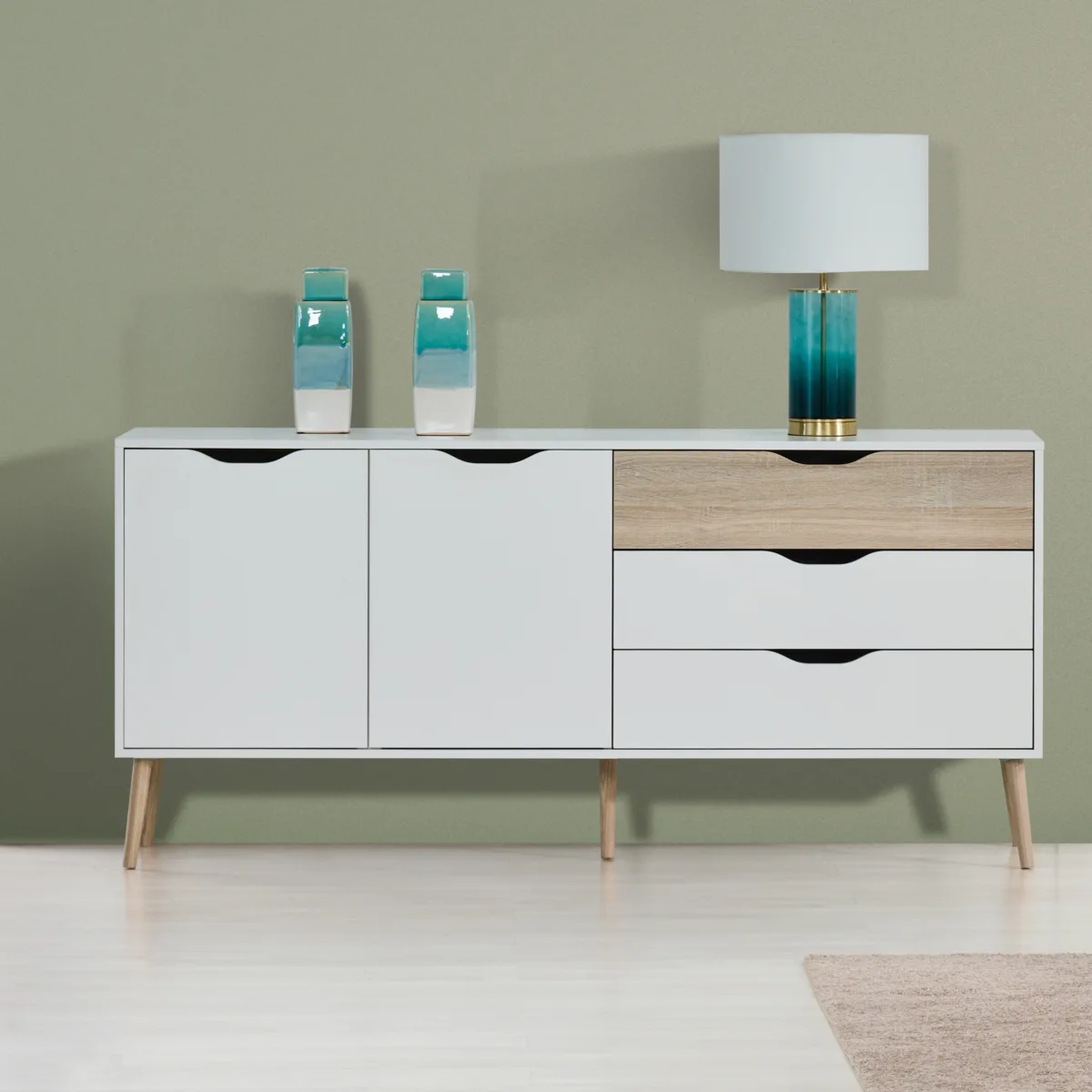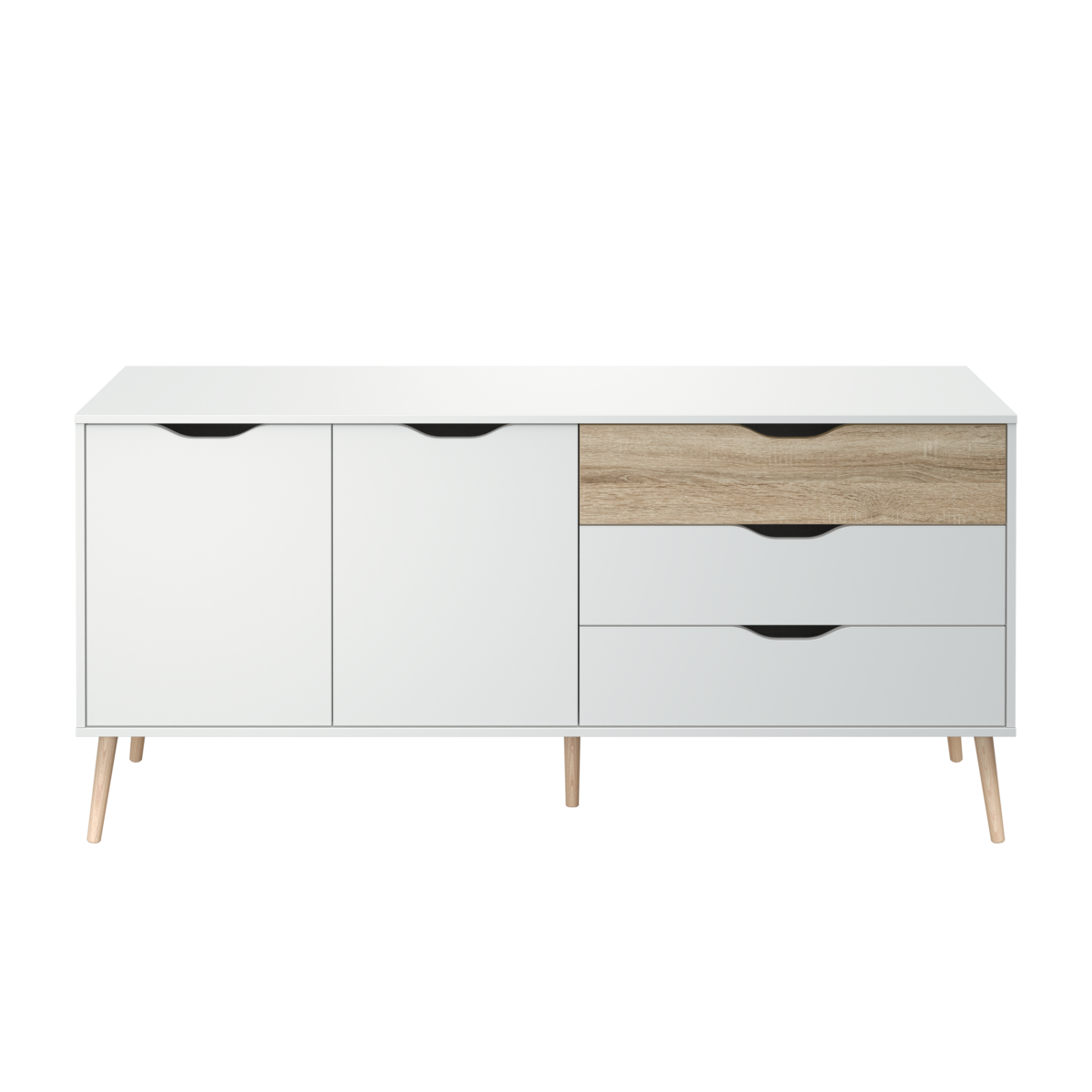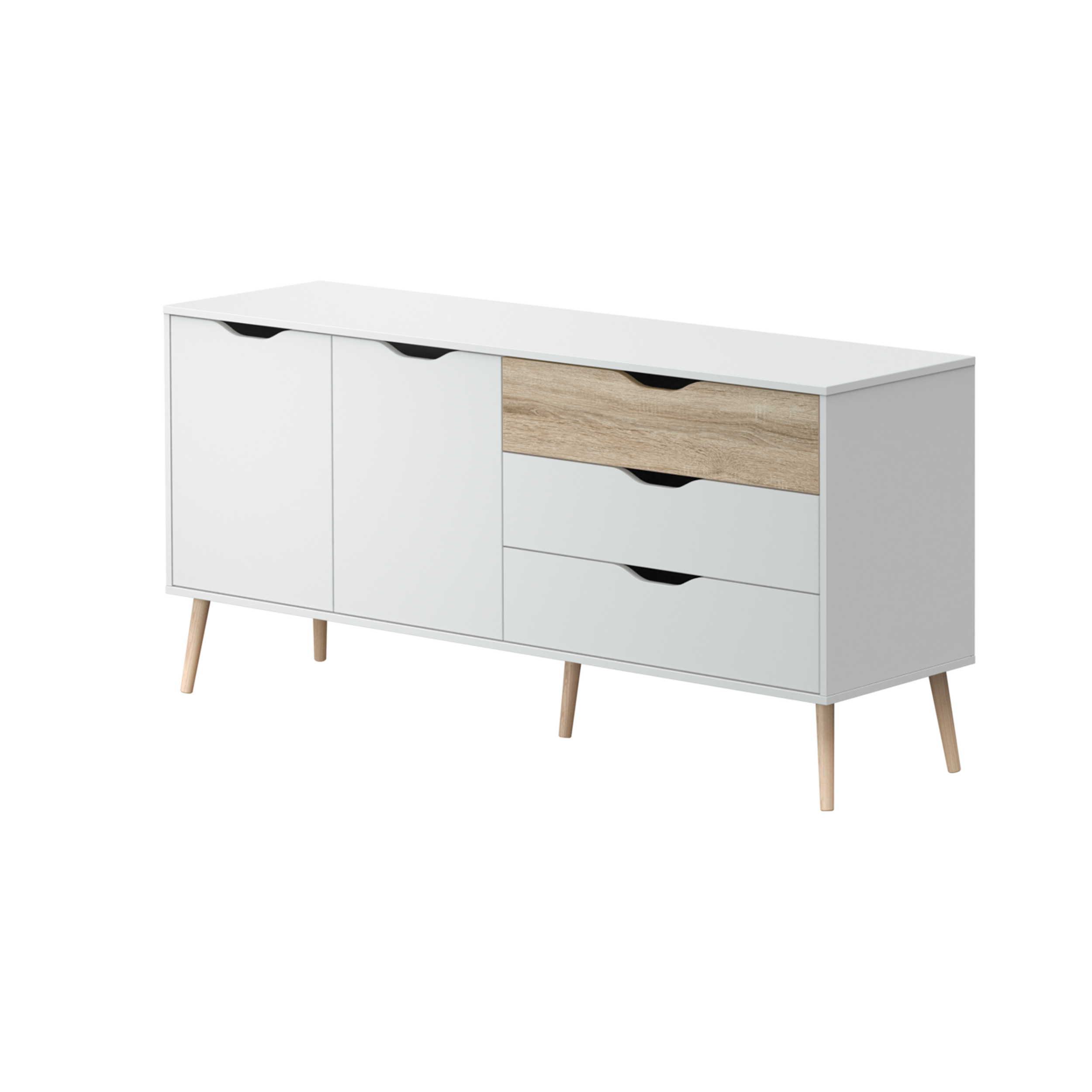 Aparador com 2 portas e 3 gavetas. Fabricado em melamina, aglomerado de madeira e MDF. Pés em madeira maciça. Acabamento na cor branco mate/carvalho natura.