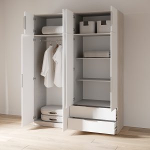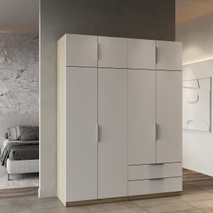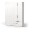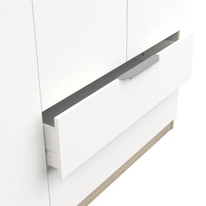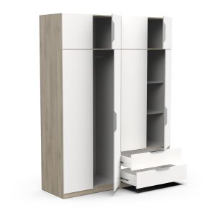 Armário com 8 portas e duas gavetas. Interior com 6 nichos, (1 deles com varão metálico). Fabricado em aglomerado de madeira. Acabamento na cor carvalho/branco. Existe nas cores branco e carvalho