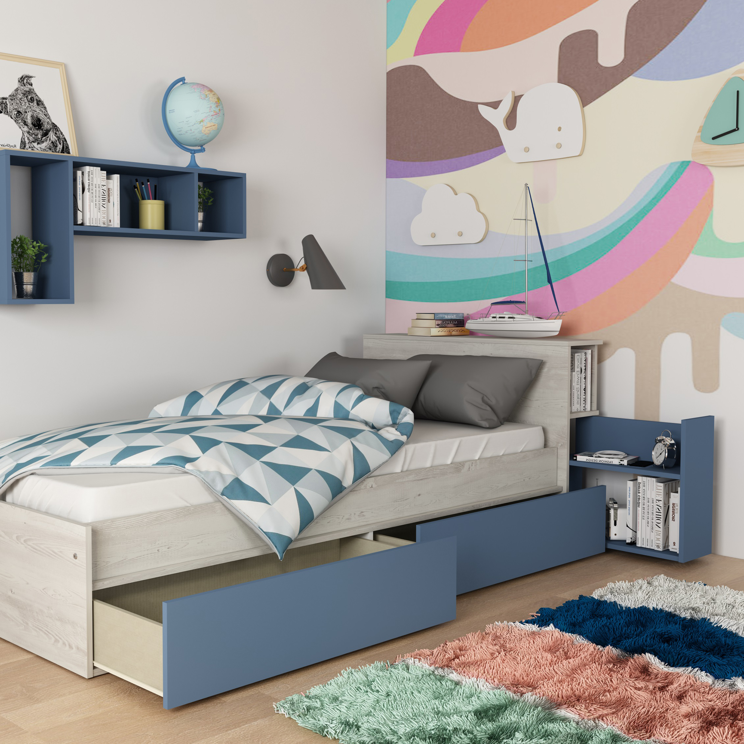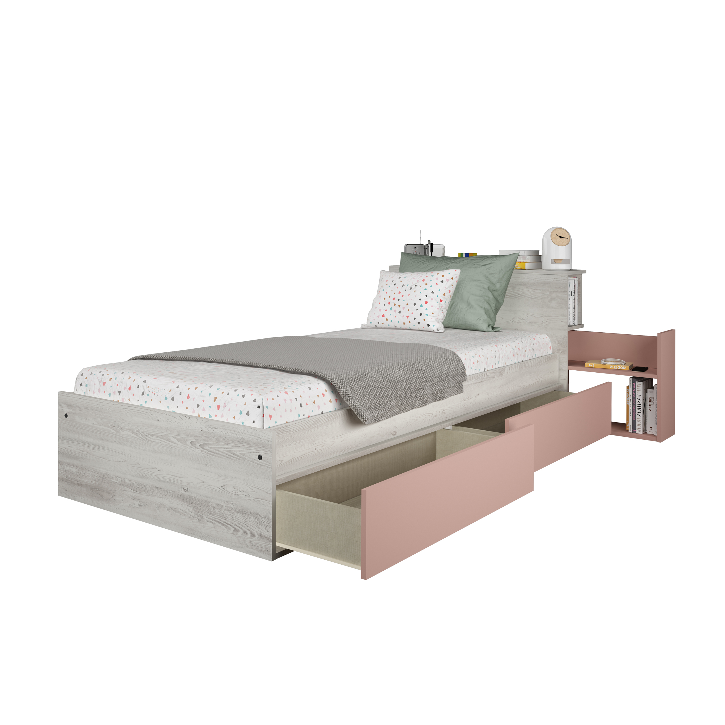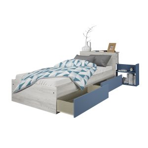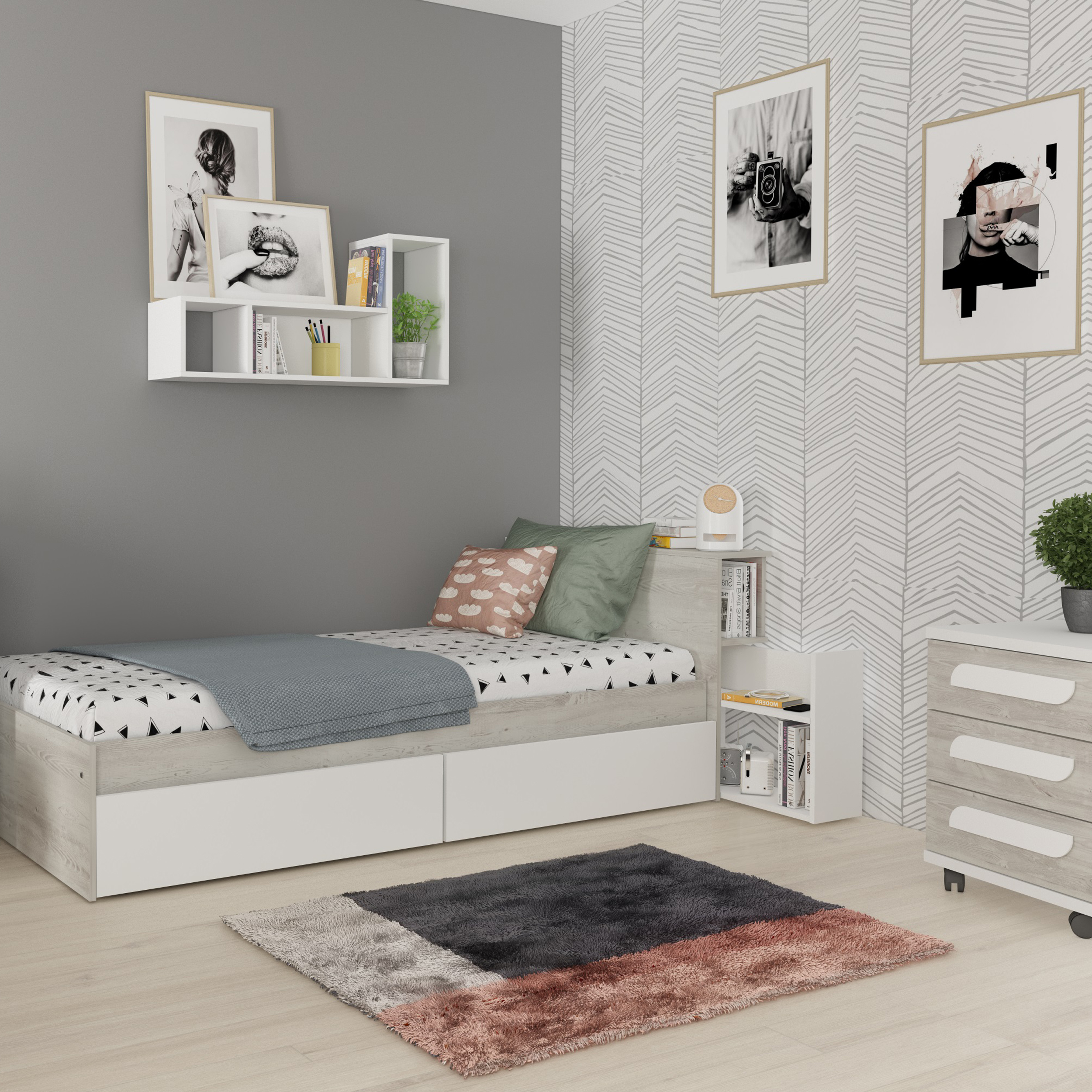 Cama compacta reversível com arrumação funcional e versátil, esta cama compacta adapta-se facilmente ao espaço, permitindo montar a zona de arrumação à esquerda ou à direita, conforme a necessidade.