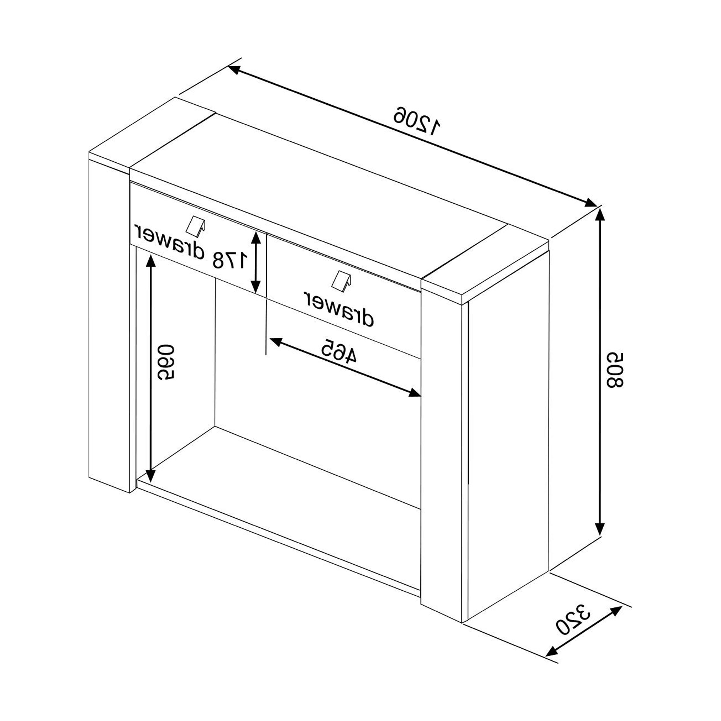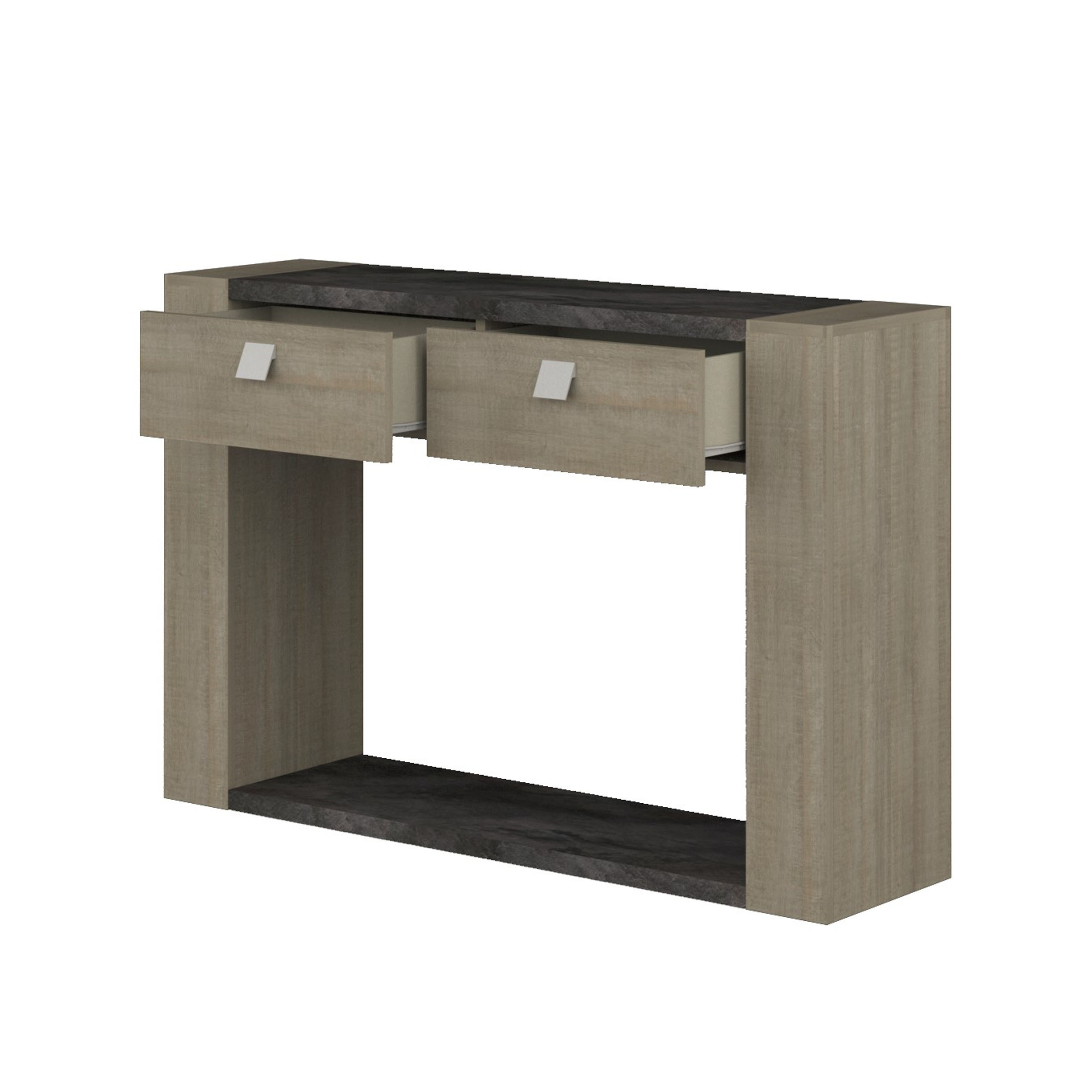 Consola com 2 gavetas e 1 prateleira, ideal para arrumação versátil. Interior das gavetas em melamina.