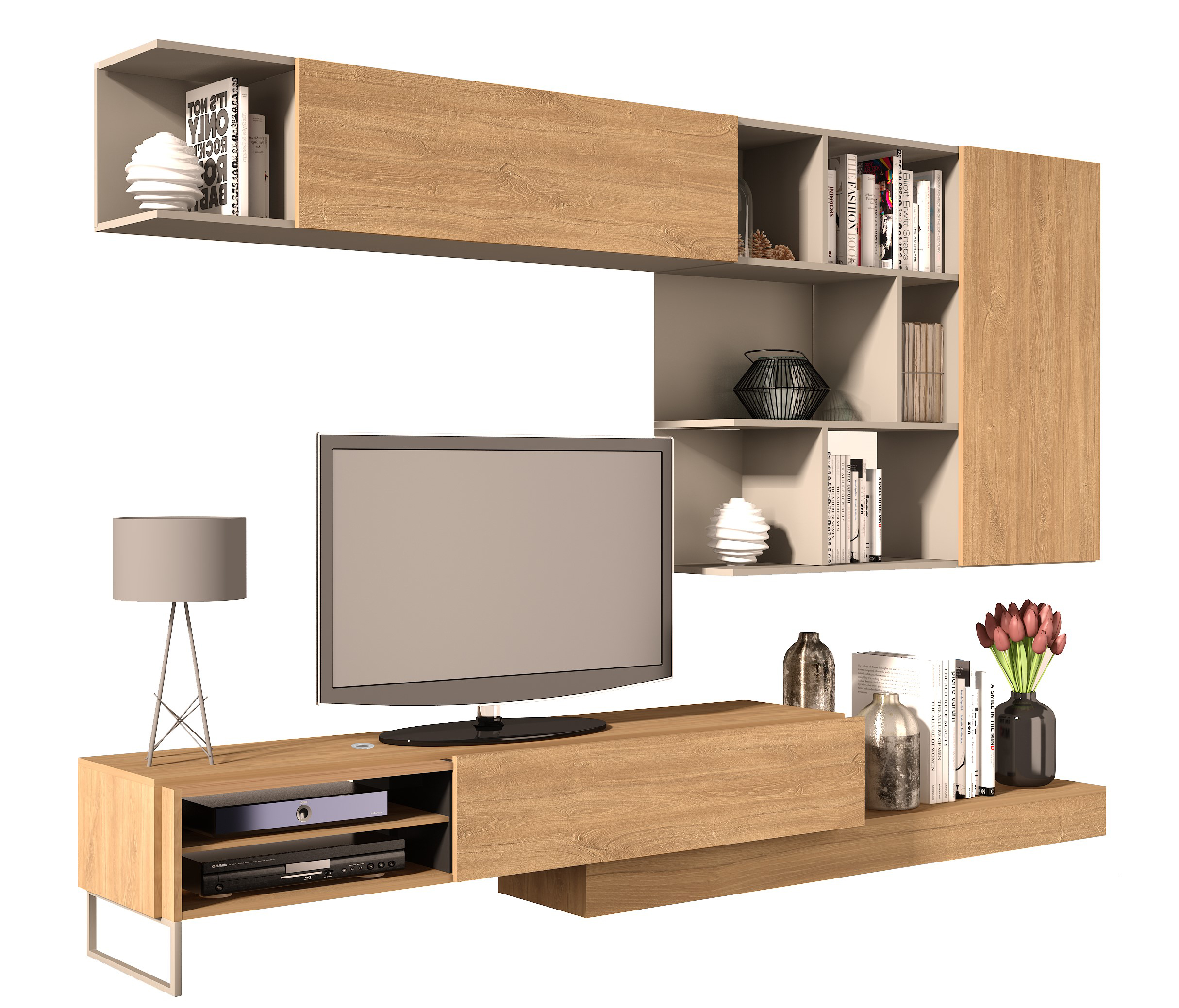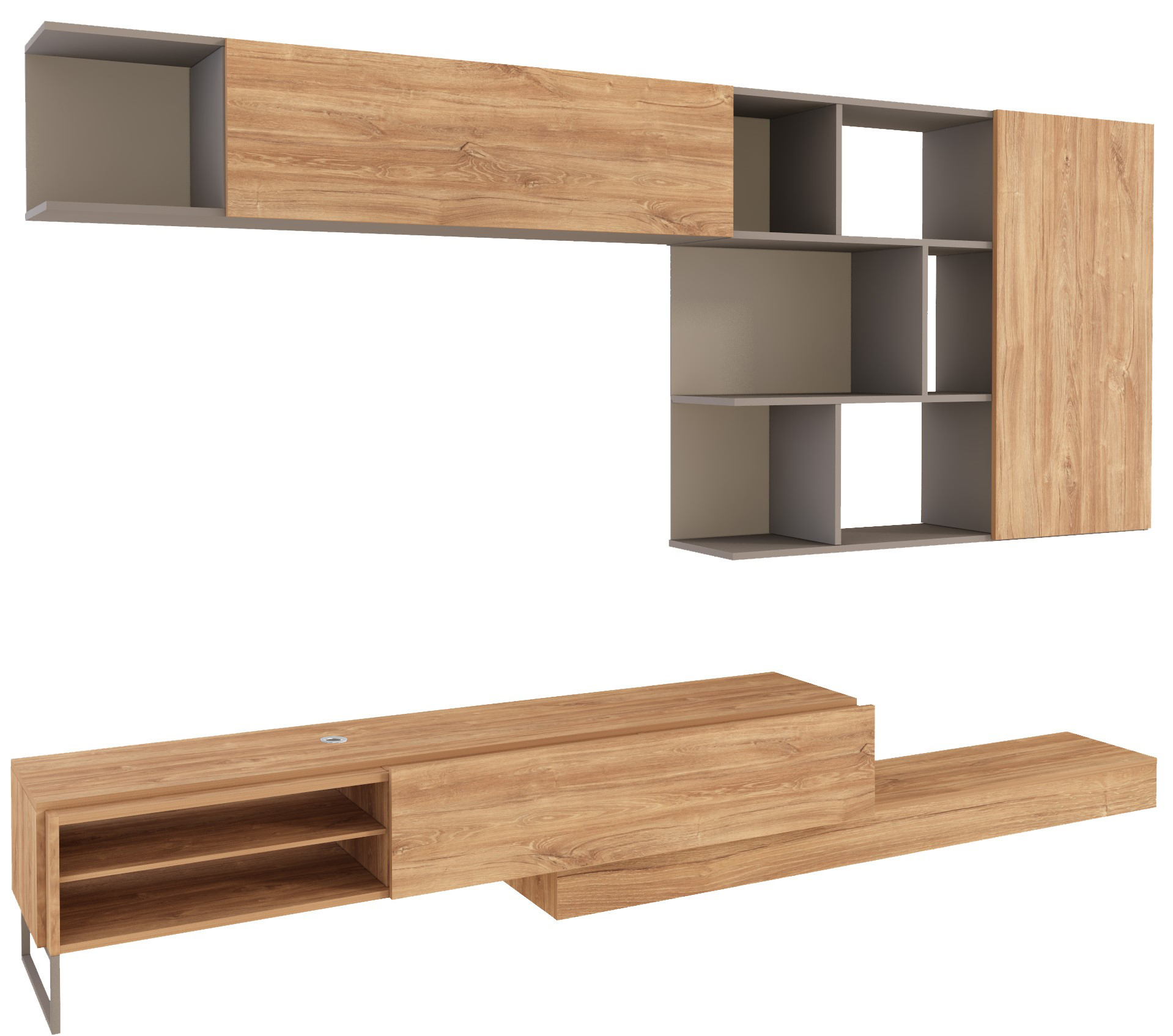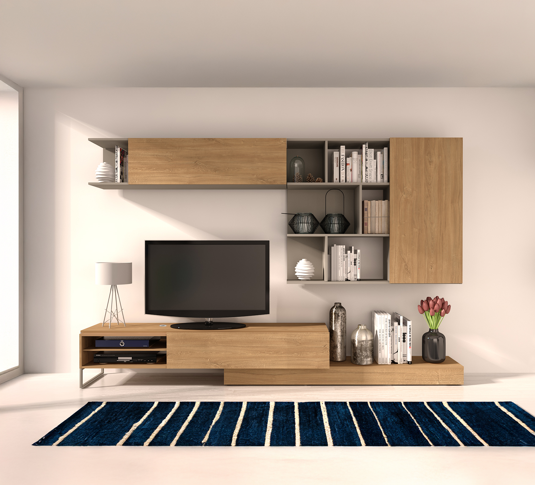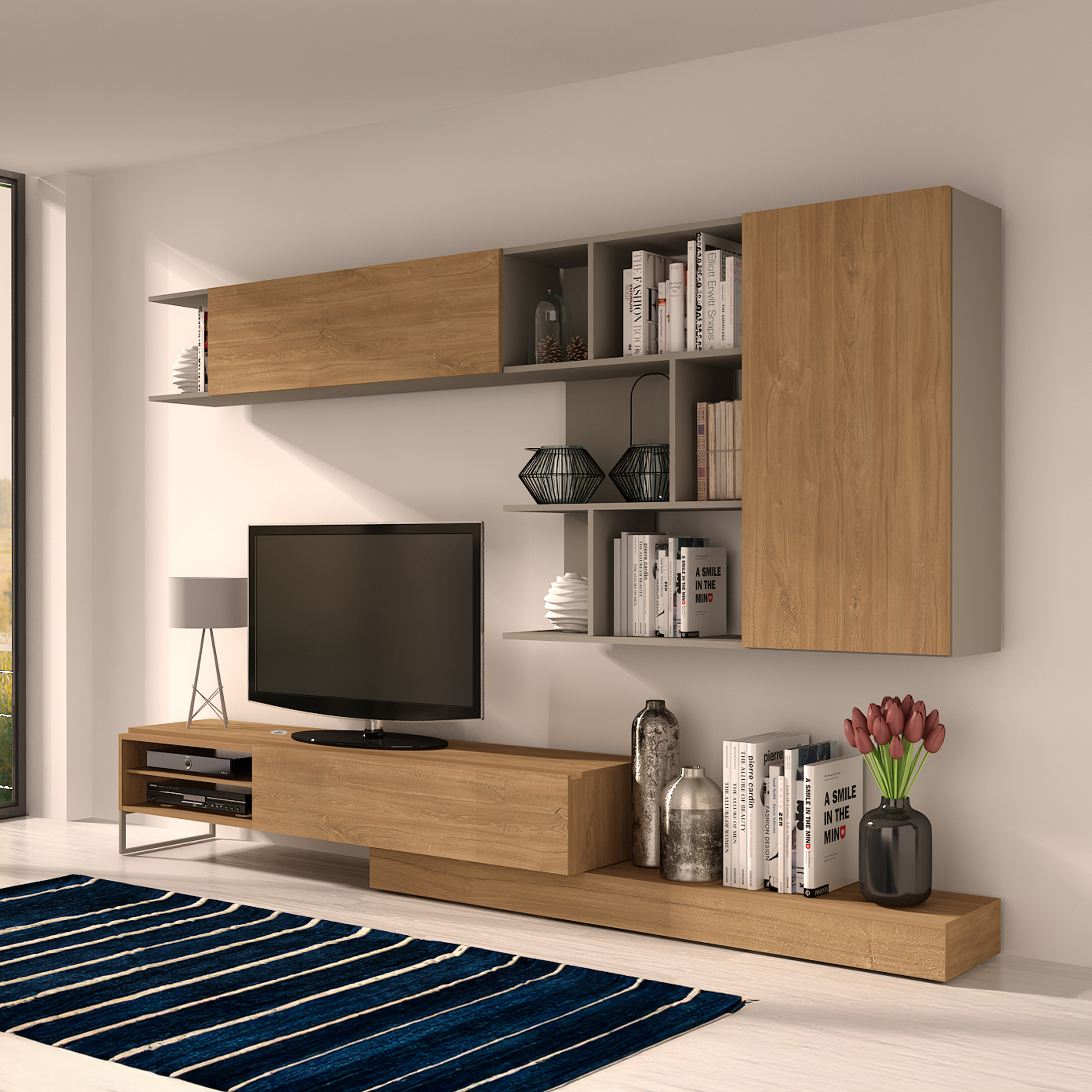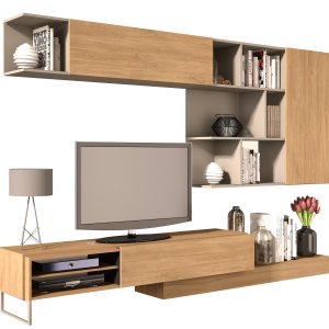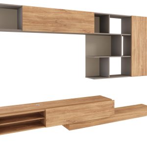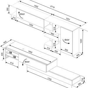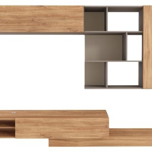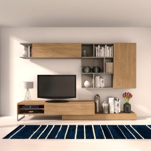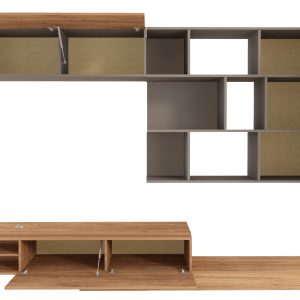 Modulo inferior, reversível. O móvel TV pode ser posicionado do lado direito ou esquerdo. Uma porta basculante. O módulo de TV pode ser deslocado, permitindo que a estante atinja a largura máxima de 309,1 cm. Suporta televisores até 55 polegadas/50Kg. Inclui passa-cabos em plástico cromado, que permite manter os fios organizados. 1 pé metálico.