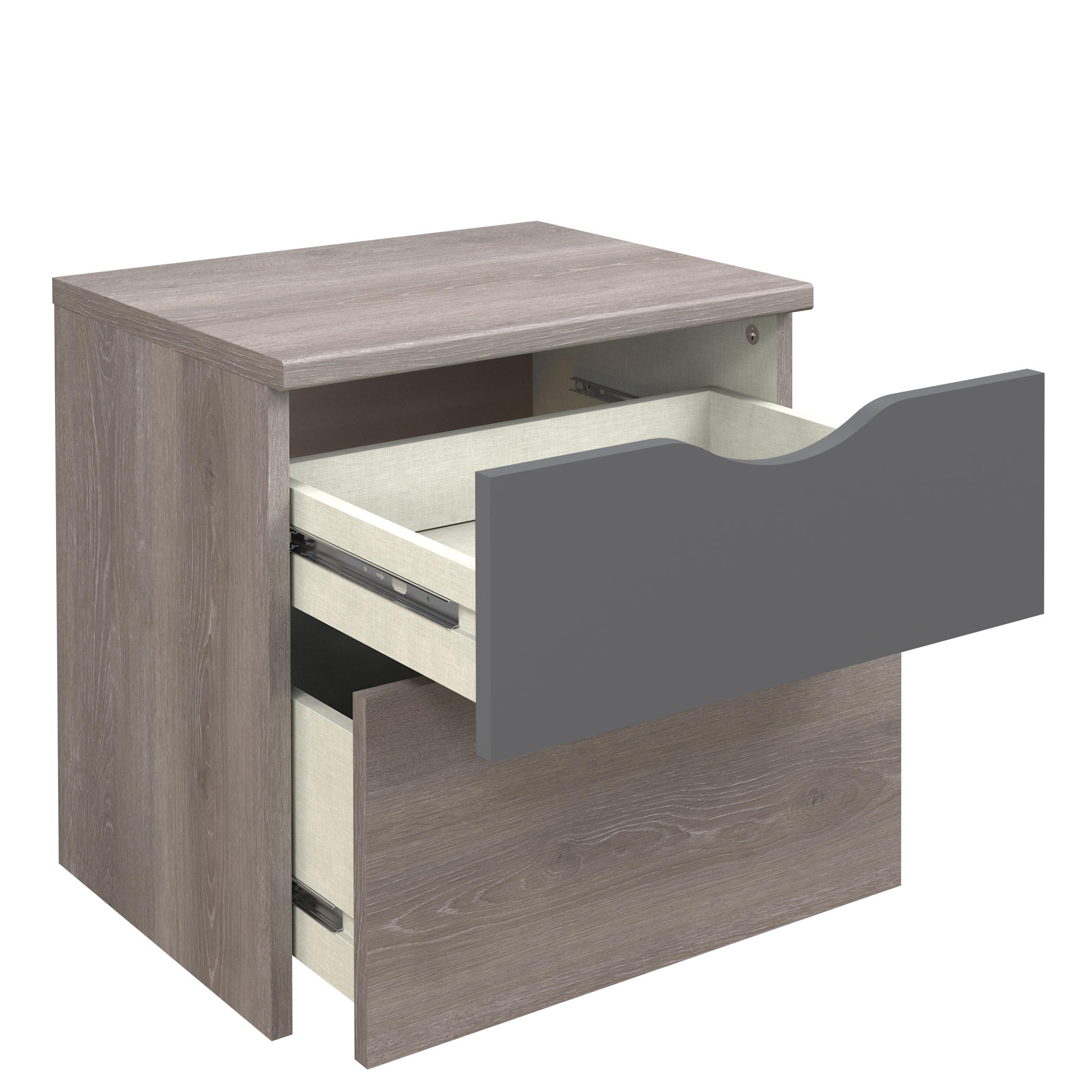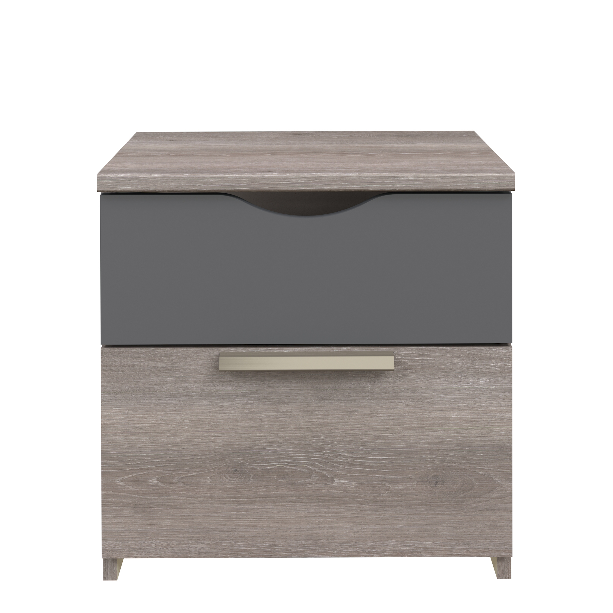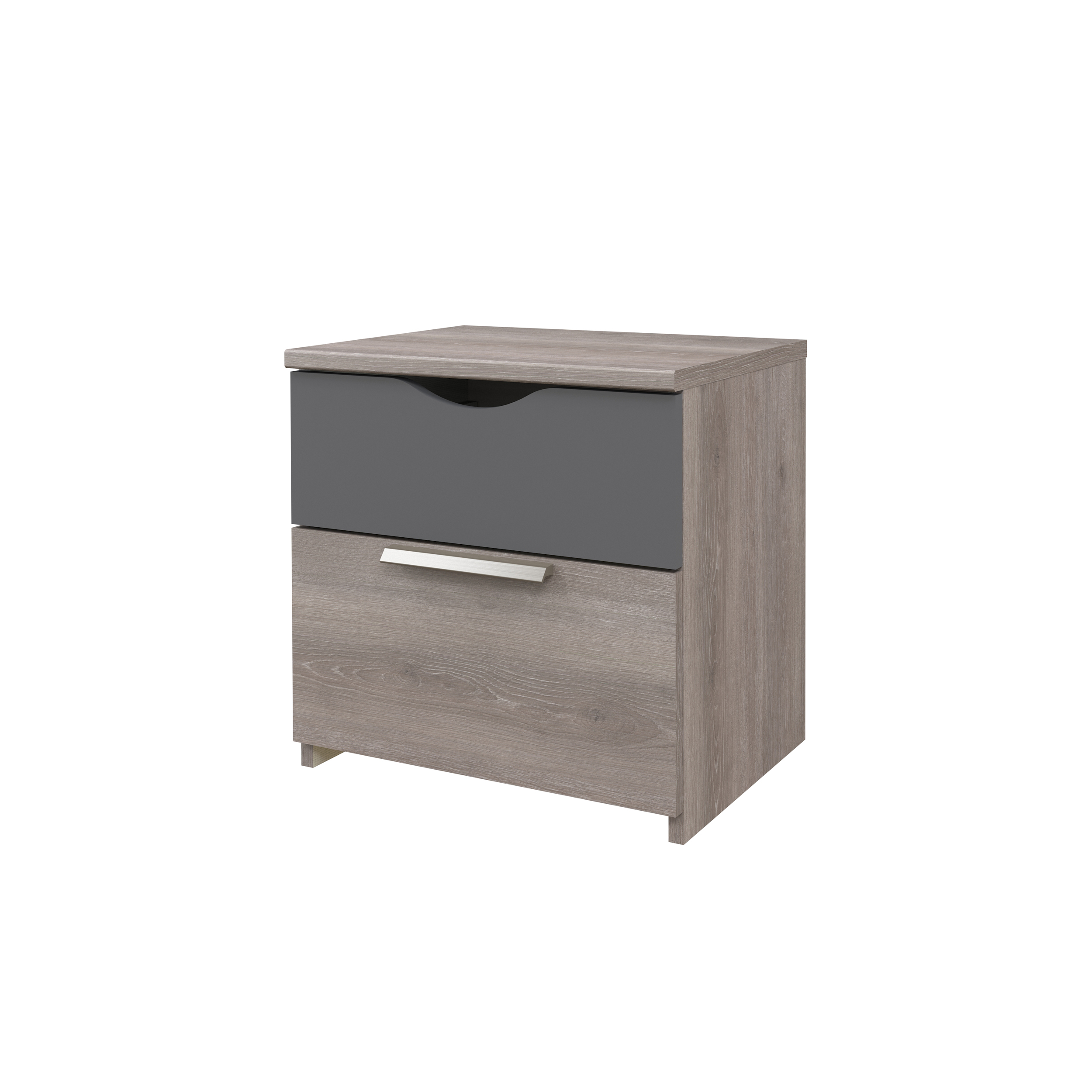 Mesa de cabeceira com 2 gavetas, cinza.