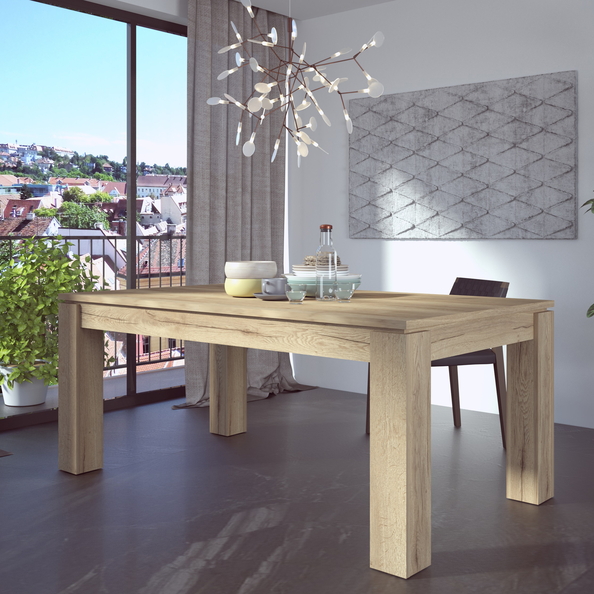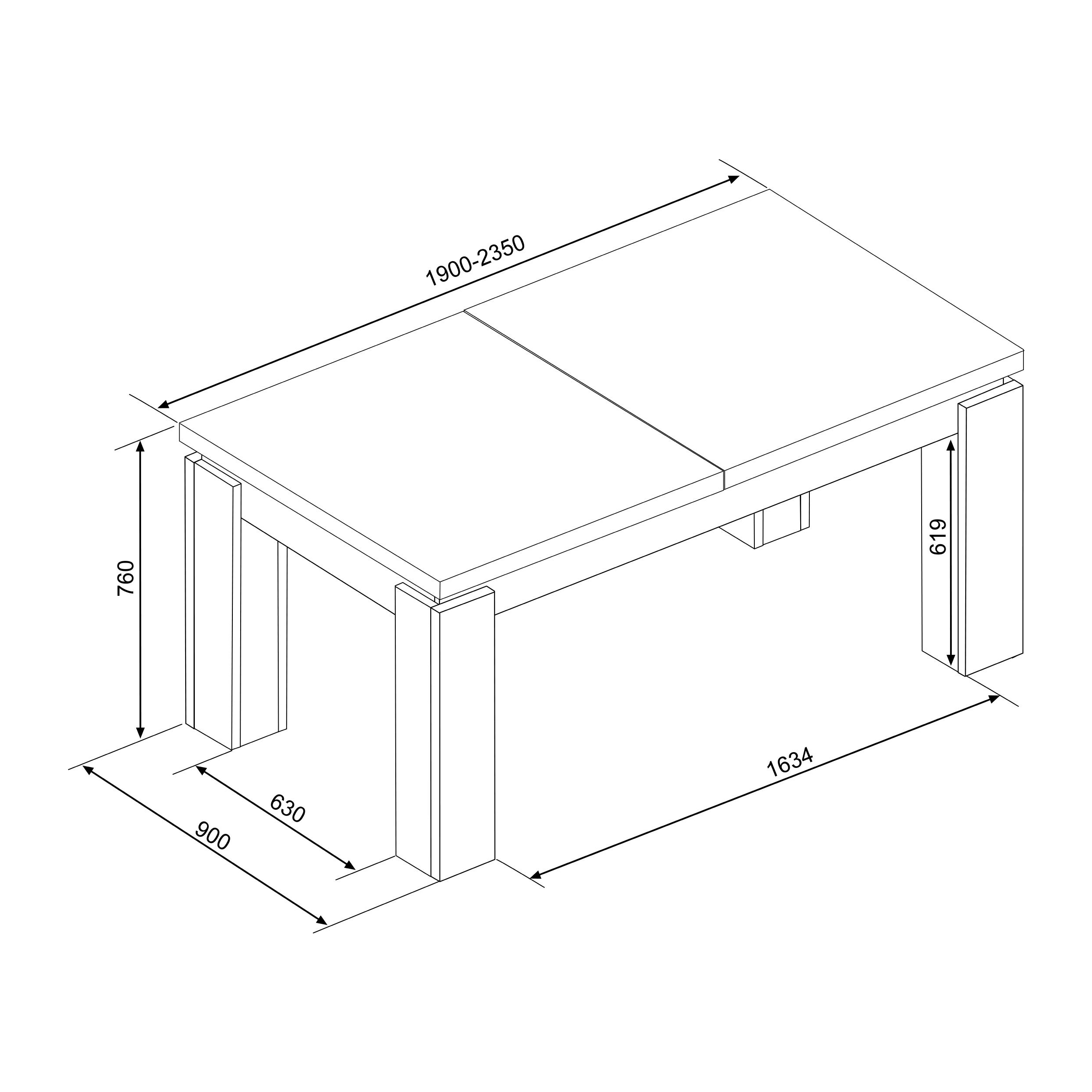 Mesa de refeição retangular adequada para 8 a 10 pessoas. Sistema de extensão fácil de utilizar, permitindo abrir a mesa com apenas uma mão, através de um mecanismo que separa o tampo em direções opostas. A tábua adicional fica armazenada de forma prática por baixo do tampo.