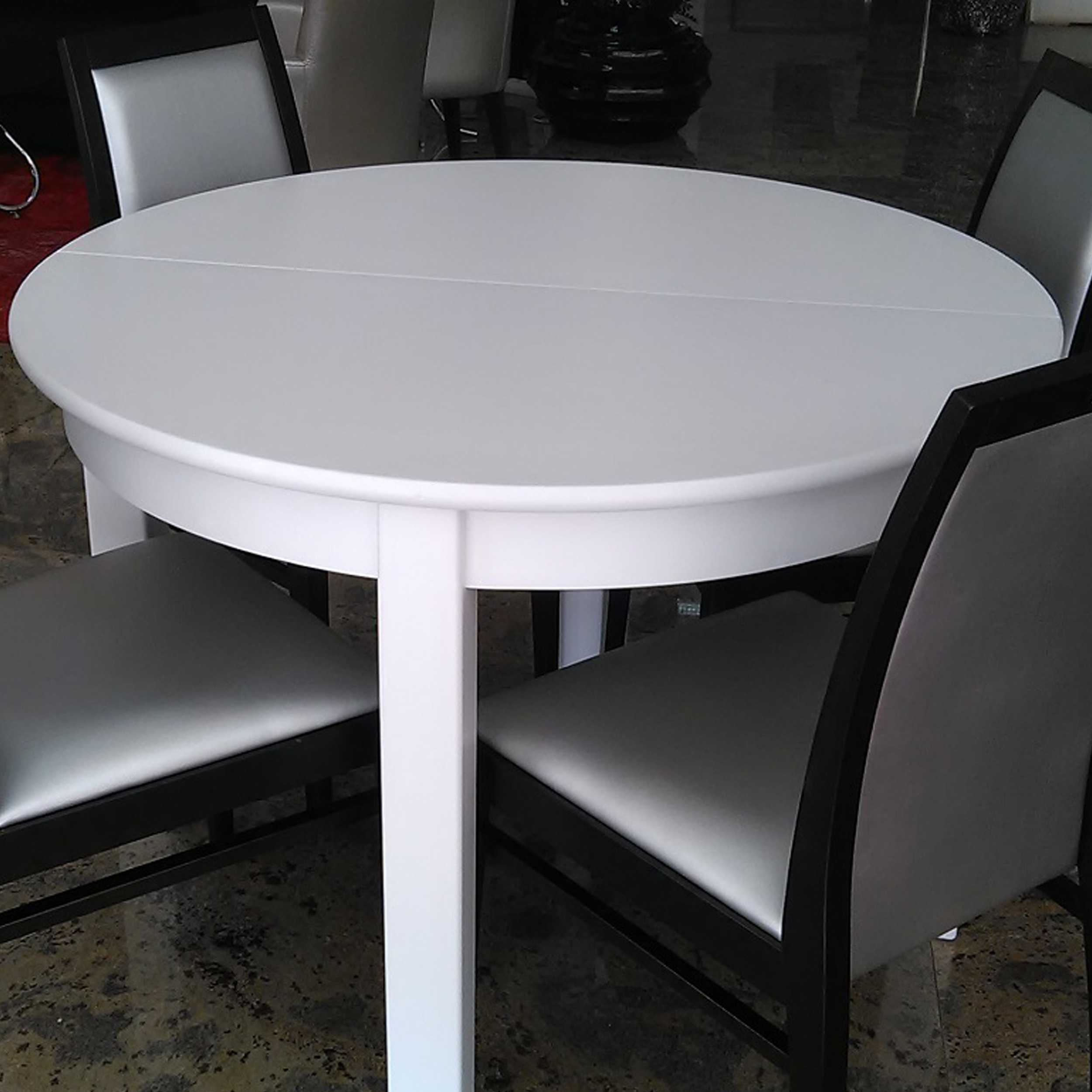 Mesa de refeição redonda, extensível. Acabamento lacado, na cor branco.