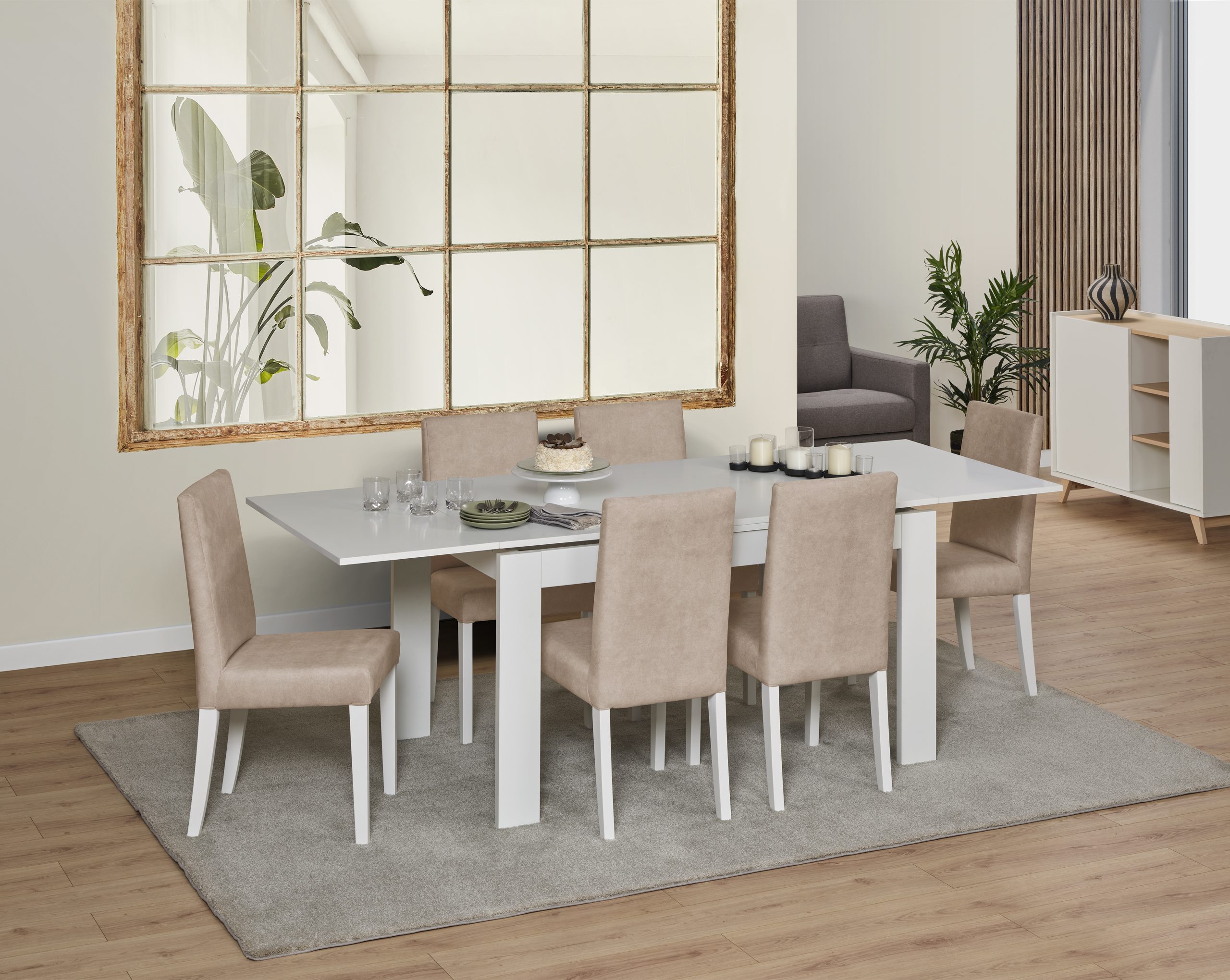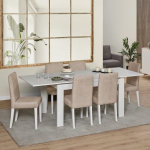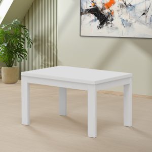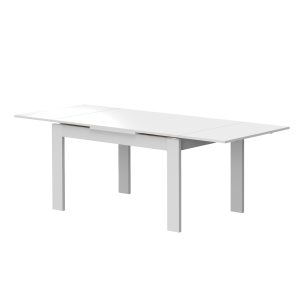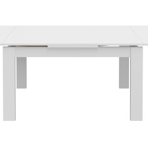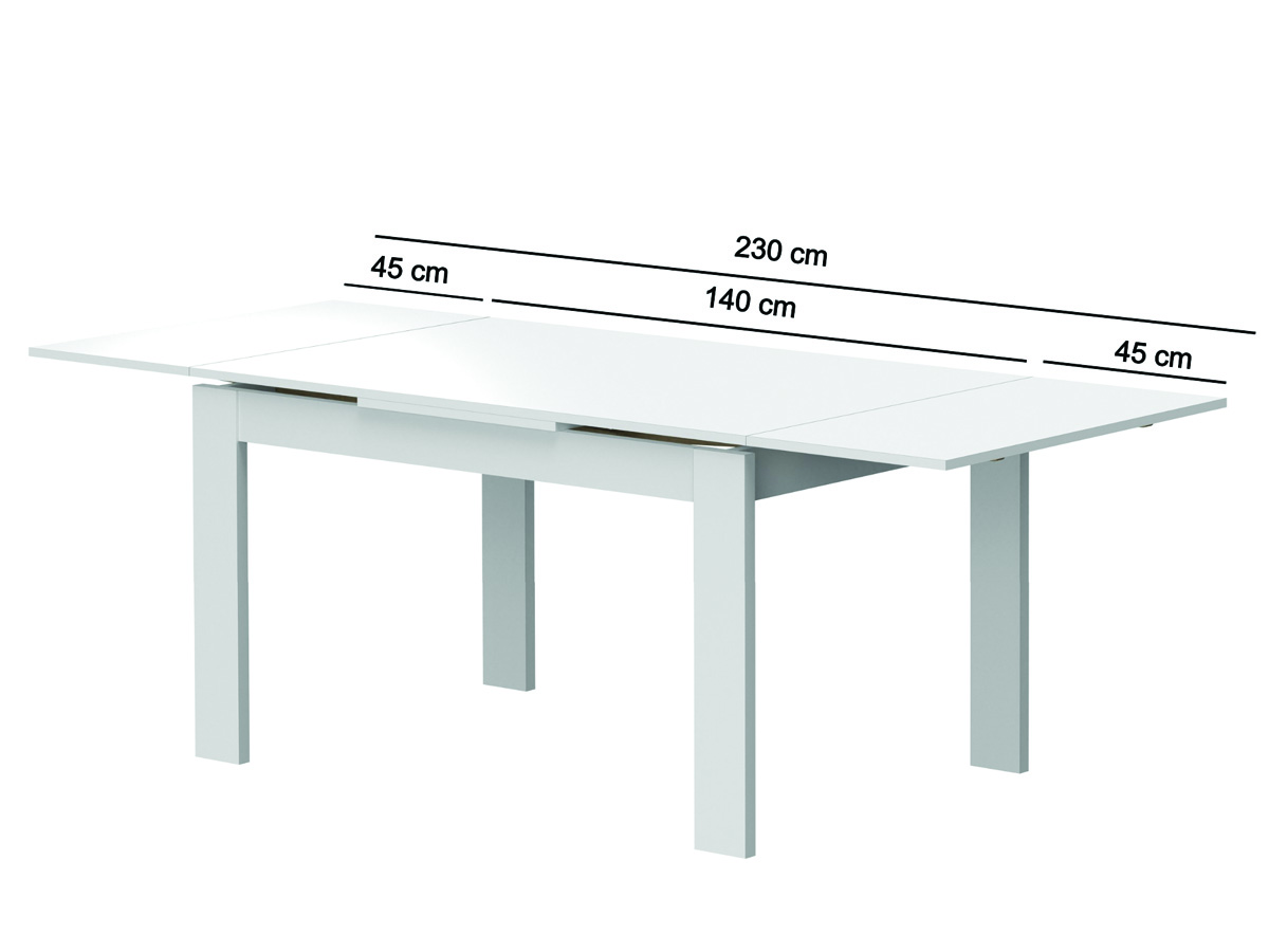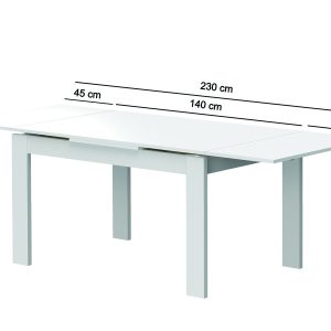 Mesa de refeição retangular, com 2 abas, com 1,90 mt e extensível até 2,30 mt. Pés em madeira. Acabamento em cor branco mate.
