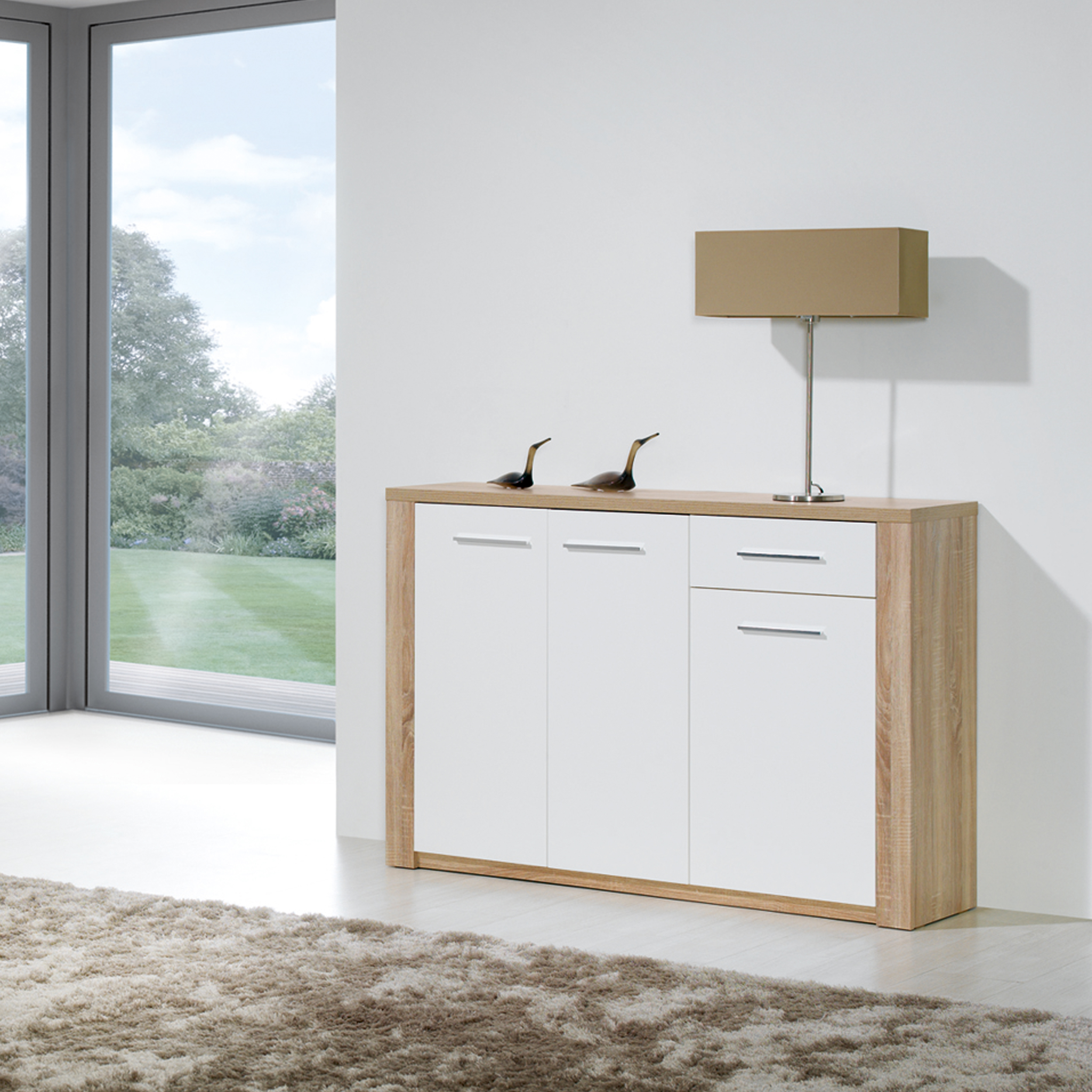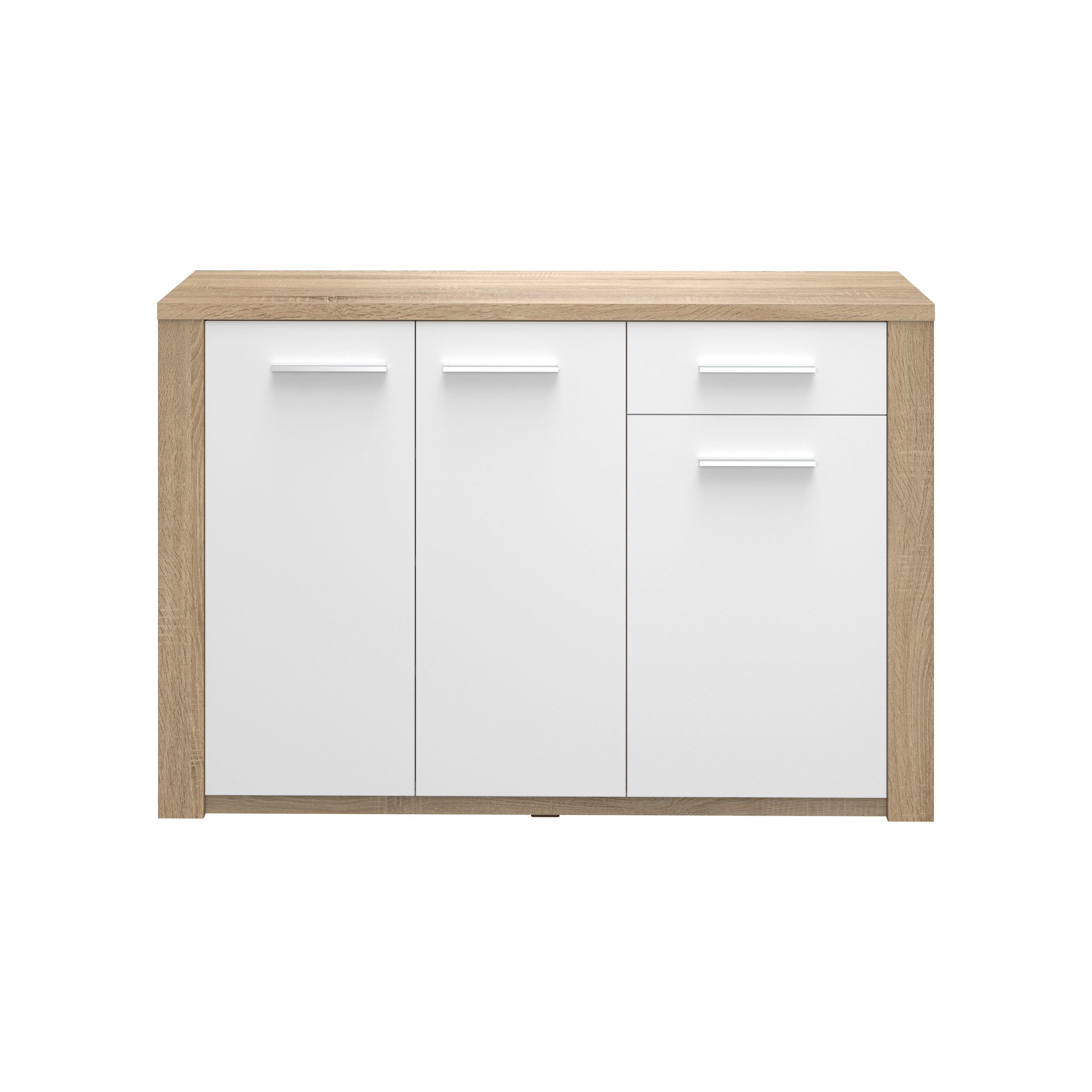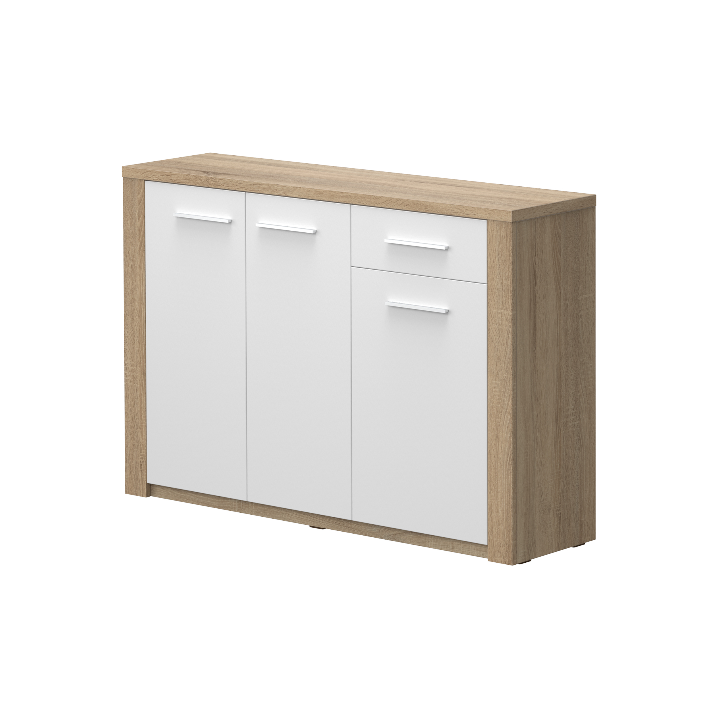 Sapateira com 3 portas e uma gaveta. Fabricado em aglomerado de madeira e MDF. Acabamento na cor carvalho natura/branco.