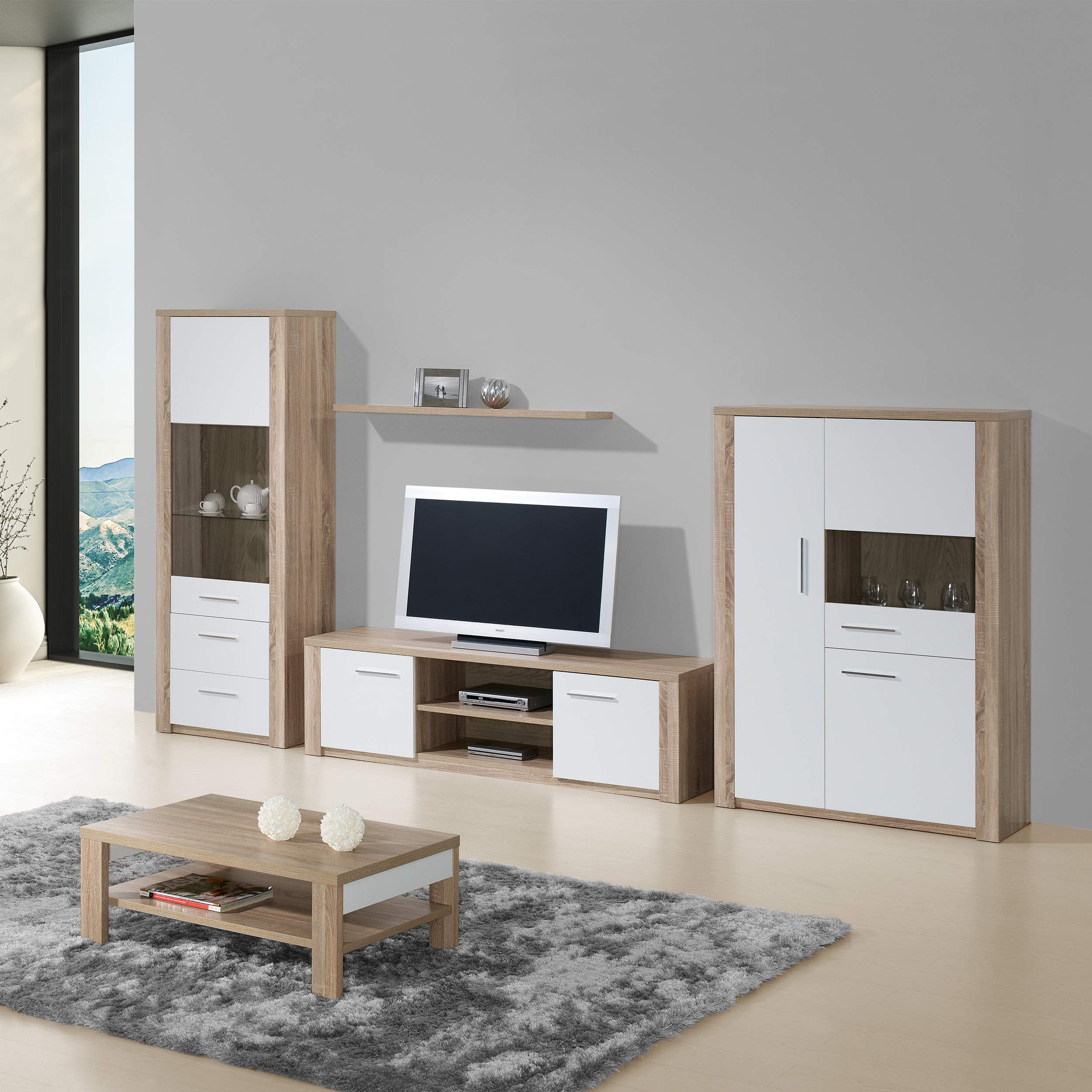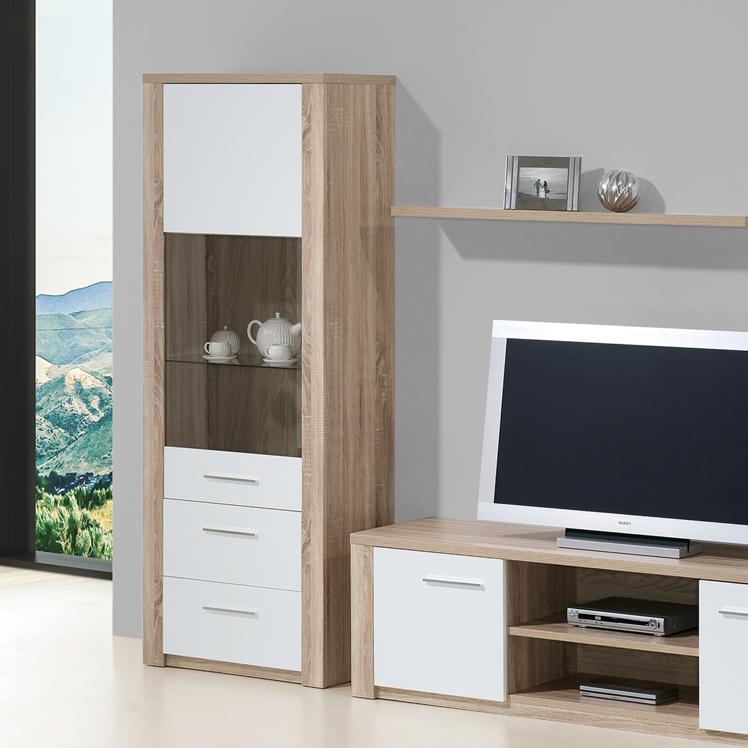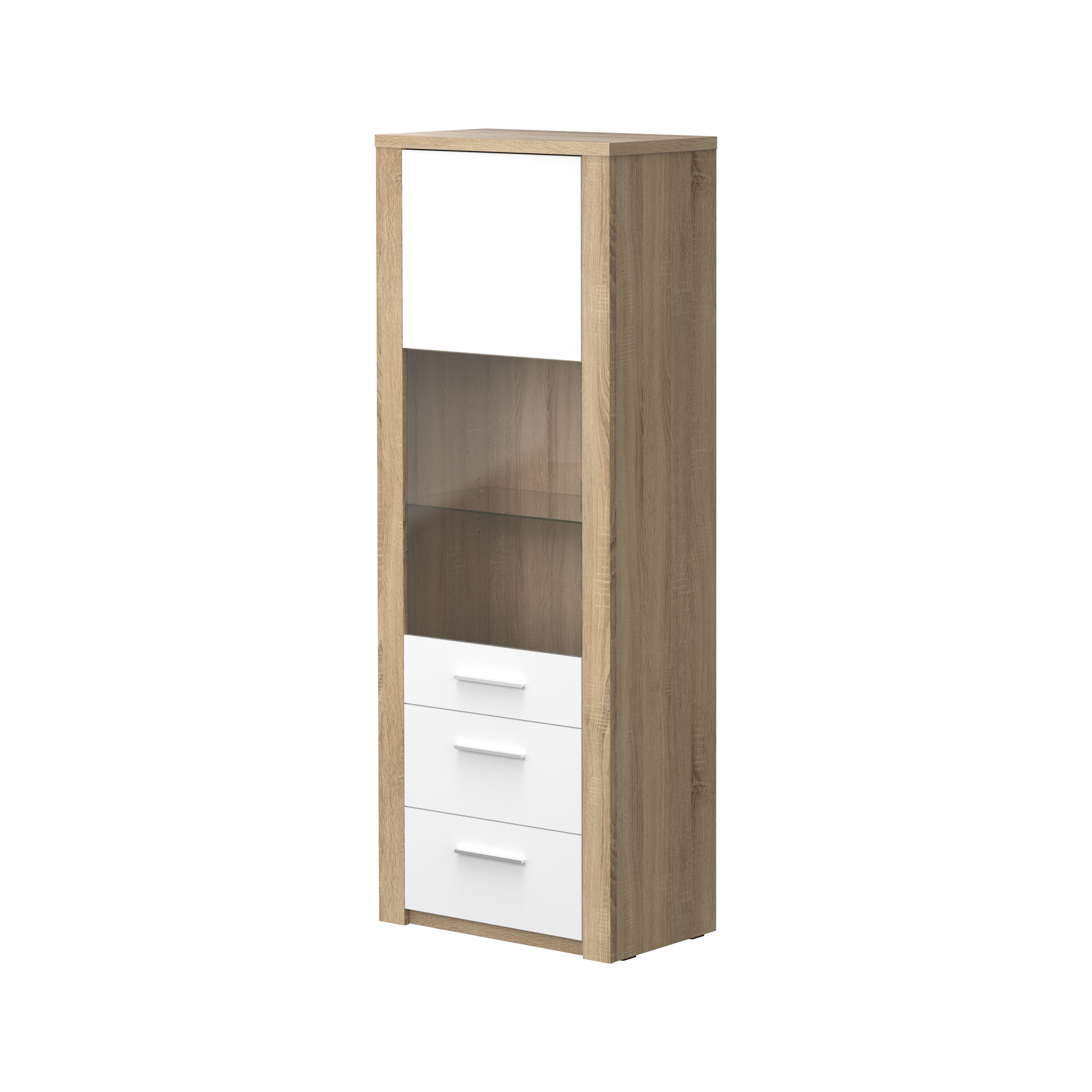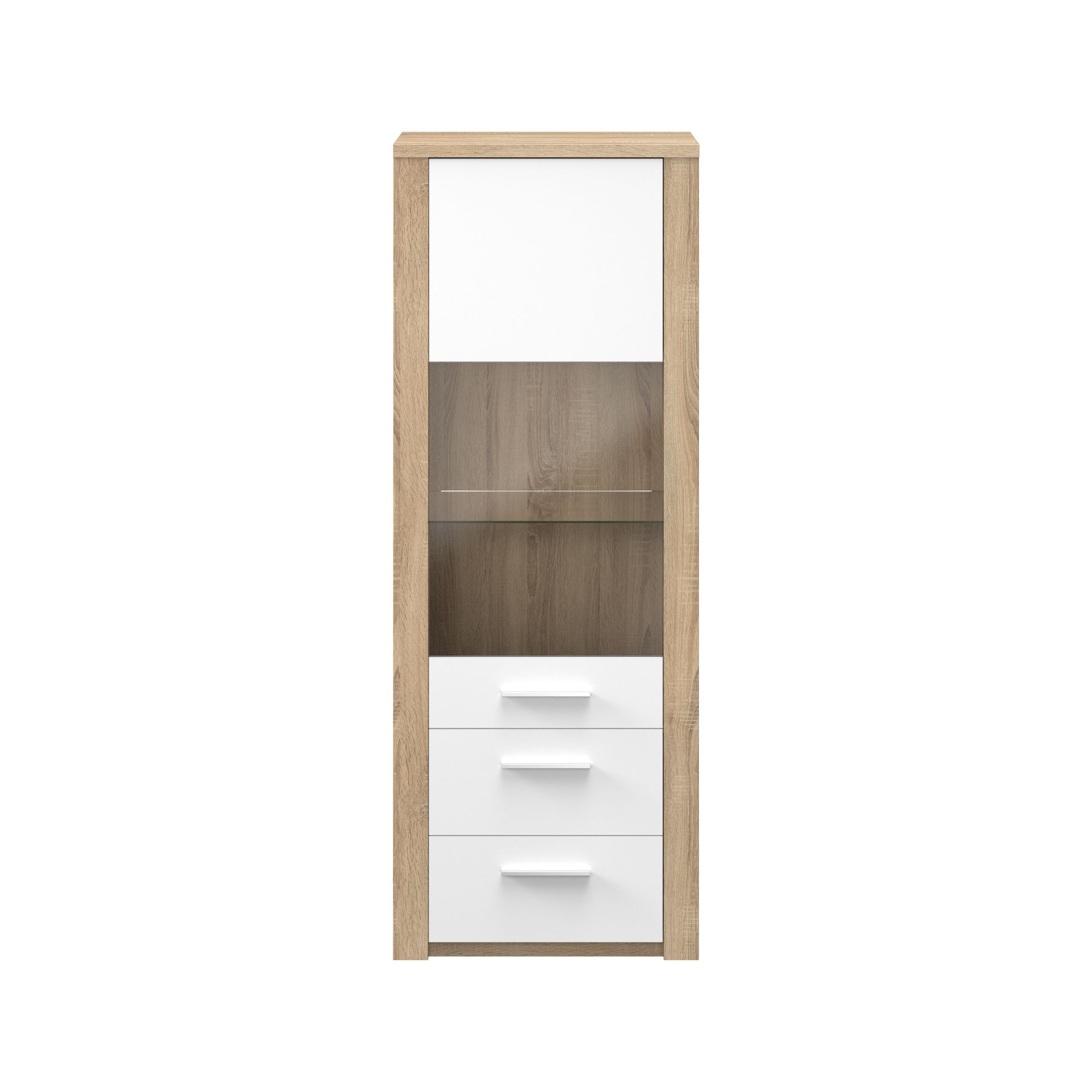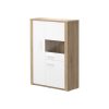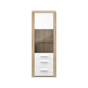 Elemento com 1 porta e duas gavetas. Fabricado em aglomerado de madeira e MDF. Acabamento na cor carvalho natura/branco.
