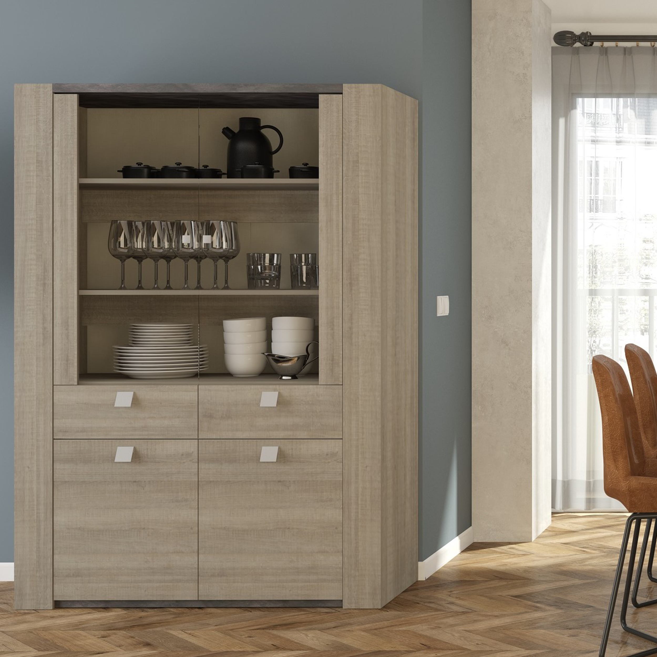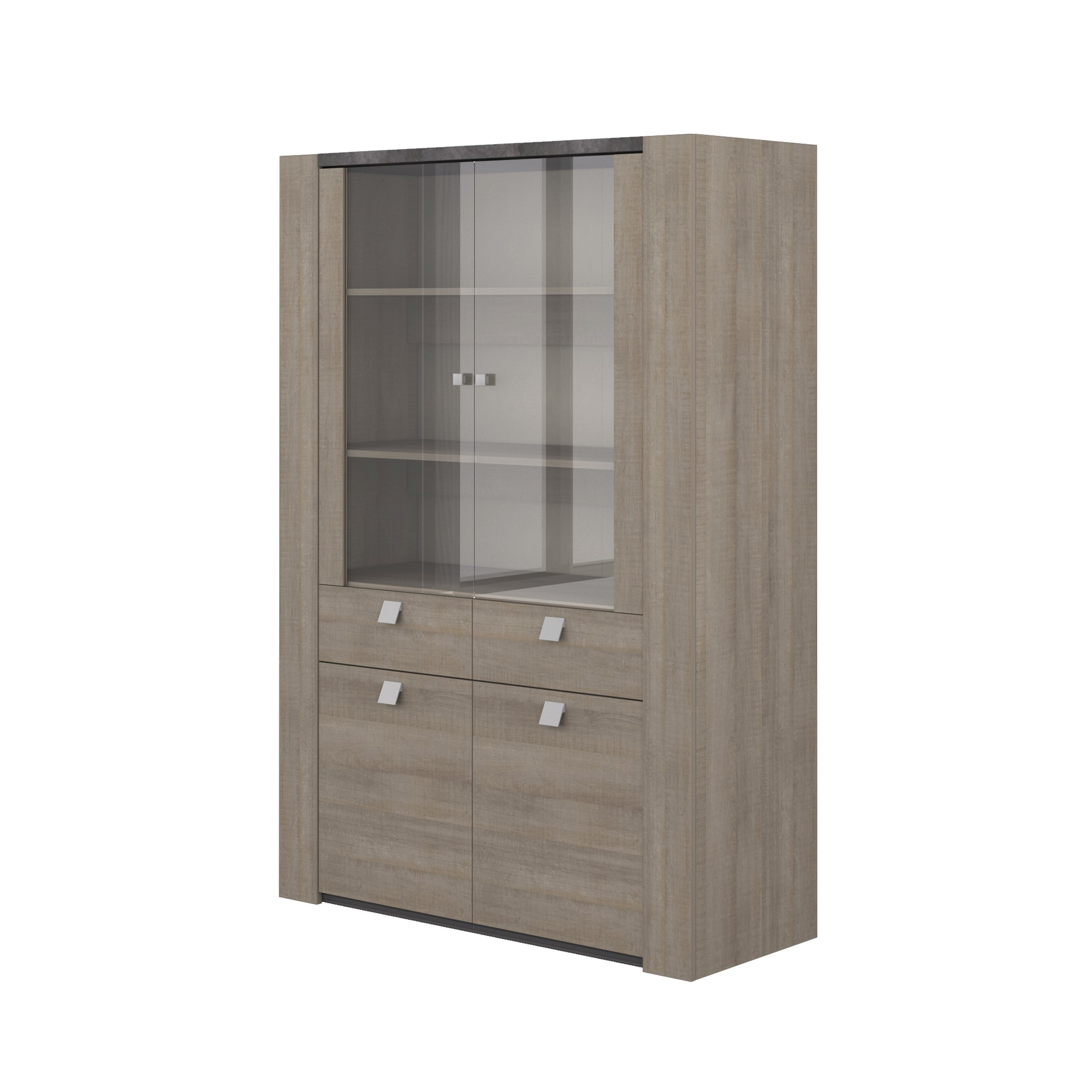 Este móvel oferece soluções práticas e elegantes para organização do seu espaço. Inclui um armário com duas portas em vidro e prateleiras interiores ajustáveis, ideal para expor e organizar os seus objetos e de um segundo armário com duas portas e prateleiras interiores ajustáveis, proporcionando um amplo espaço de arrumação mais reservado. Dispõe ainda de duas espaçosas gavetas com interior em melamina com acabamento decorativo.